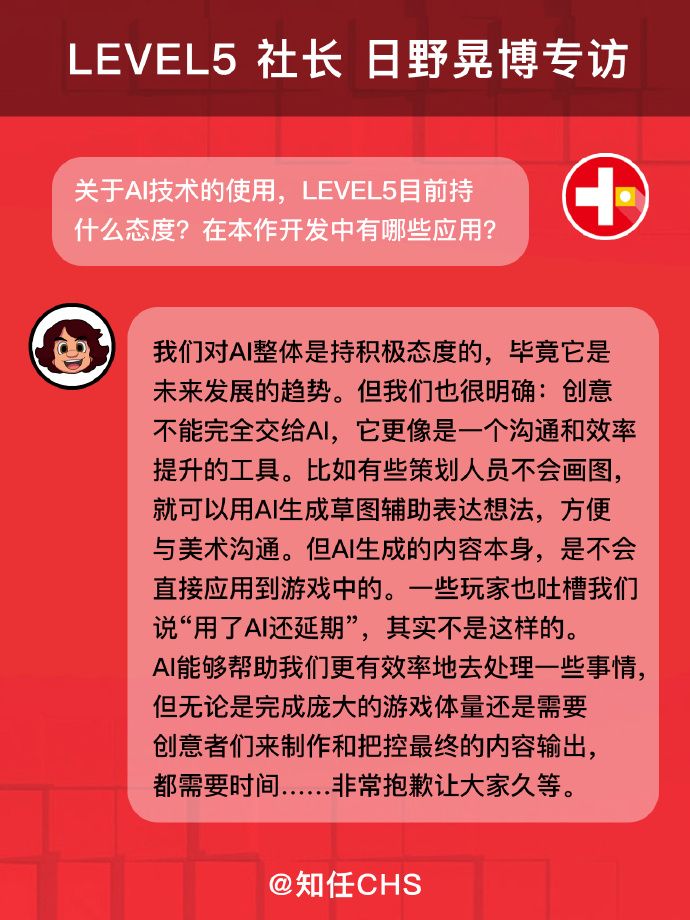 該言論來自中國任天堂社群帳號「知任CHS」所進行的正式專訪,內容原意清楚闡述了日野對 AI 的看法:「我們對 AI 整體是持積極態度的,但我們也很明確——創意不能完全交給 AI,它更像是一個溝通和效率提升的工具。」