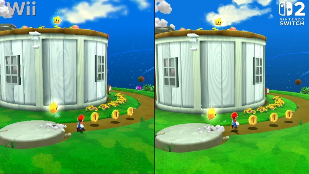 根據 Digital Foundry 的測試,《超級瑪利歐銀河合輯 1+2》在 Switch 1 上以 1080p / 60fps 穩定運行,而在 Switch 2 上更提升至 4K / 60fps。最明顯的升級來自貼圖品質——從草地到星球表面,再到瑪利歐工裝褲的縫線,全都細節滿滿。以往 Wii 版本那種「朦朧美」的模糊感幾乎消失,如今的星際舞台更像是重製級的重生。