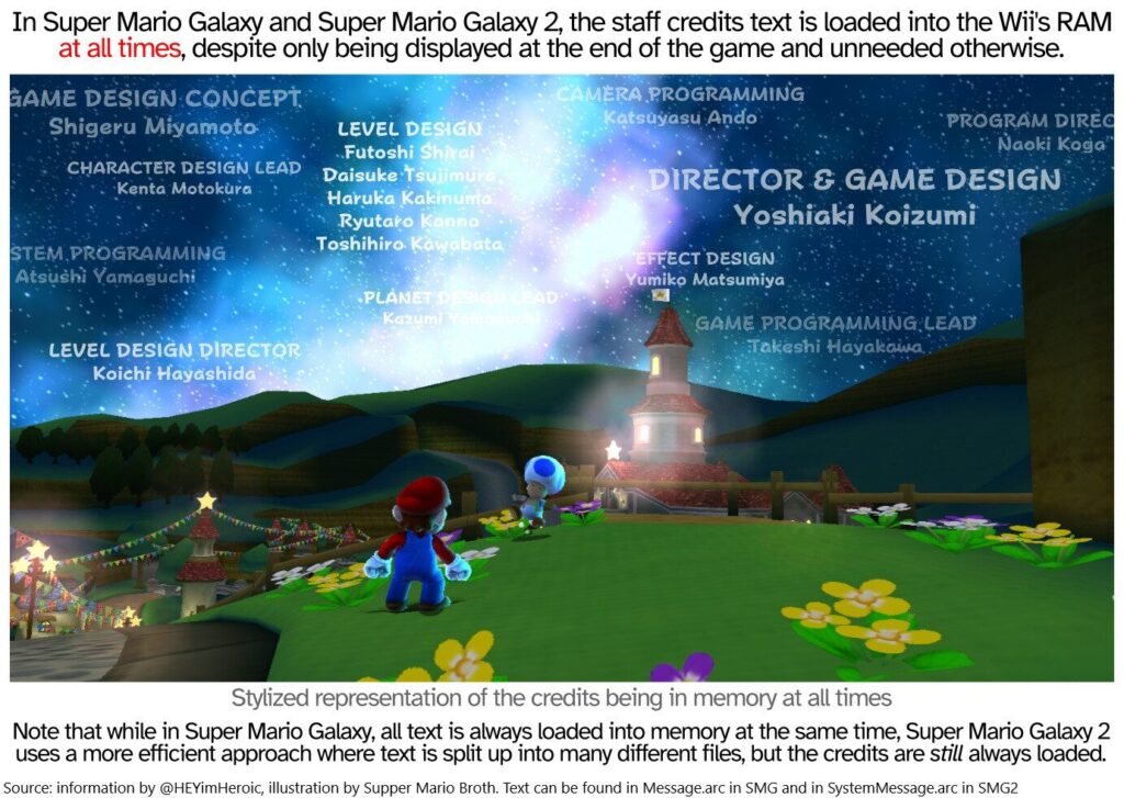 根據知名任天堂情報帳號 @MarioBrothBlog 的揭露,原版 Wii《Super Mario Galaxy》竟然會在整個遊戲過程中,把「製作人員名單」常駐載入 RAM(記憶體)裡! 也就是說,就算你才剛從蛋形星球起飛、還沒破第一顆星,背景裡早就默默載好了開發團隊的名字。