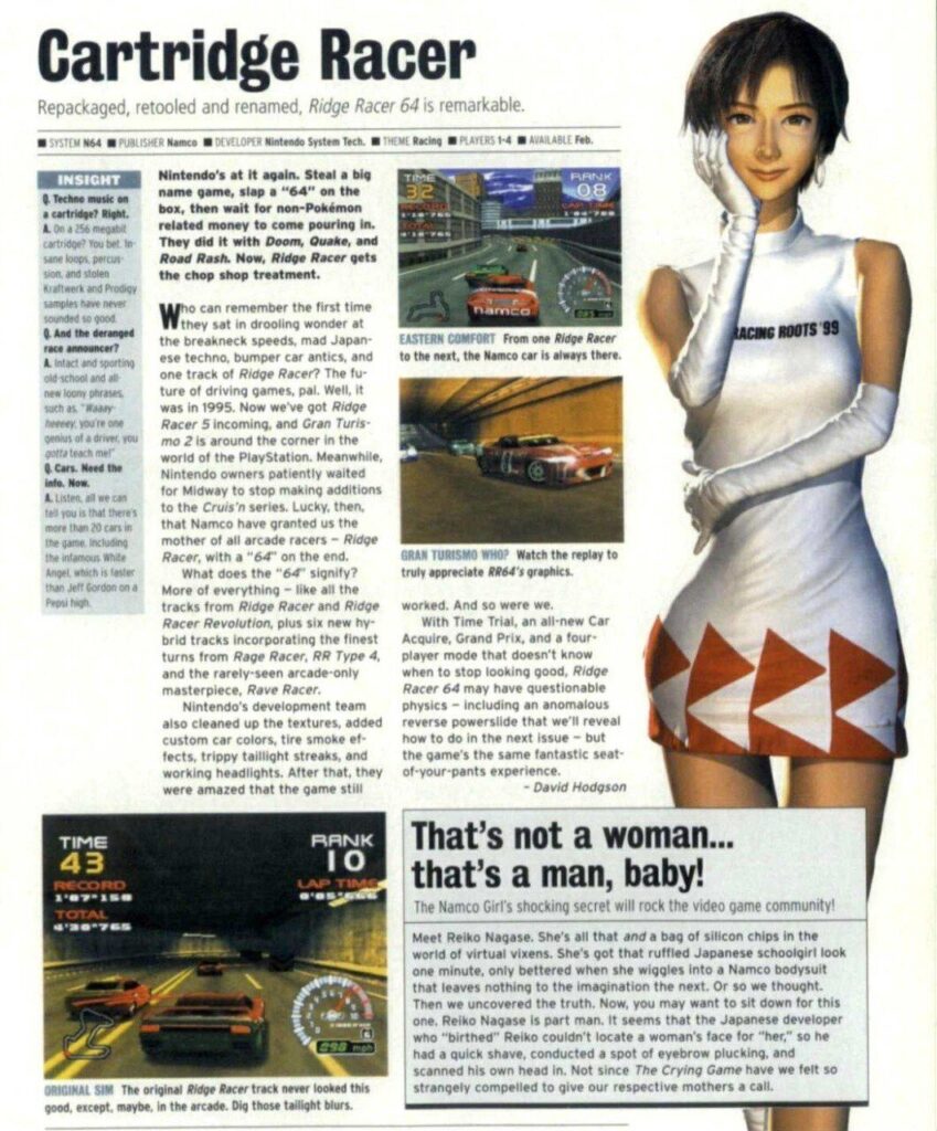 雜誌甚至用了極具挑釁的語氣寫道:「那可不是女人,那是男人,寶貝!」接著補上一句:「Reiko Nagase的真相將震撼整個遊戲圈!」——並在內文裡聲稱Reiko的創作者、Namco遊戲設計師由水桂(Kei Yoshimizu)因找不到女性模特兒,乾脆「自己刮鬍子、修眉、掃描臉部」作為角色建模參考。這種聳動風格,完完全全是90年代遊戲雜誌的典型調調!