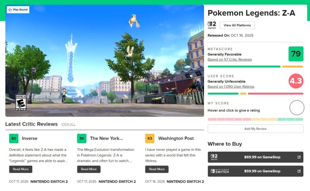 從 83 分跌到 79 分,《Pokémon Legends: Z-A》(寶可夢傳說 Z-A)上市僅數日,雖然獲得媒體普遍好評,卻在玩家端慘遭灌爆式負評。在 Metacritic 上,《Z-A》的媒體均分目前為 79 分(原為 83 分),但用戶評分僅有 4.1 分,其中高達六成以上為負評。這場評分風暴讓原本備受期待的作品,成為系列史上最具爭議的作品之一!