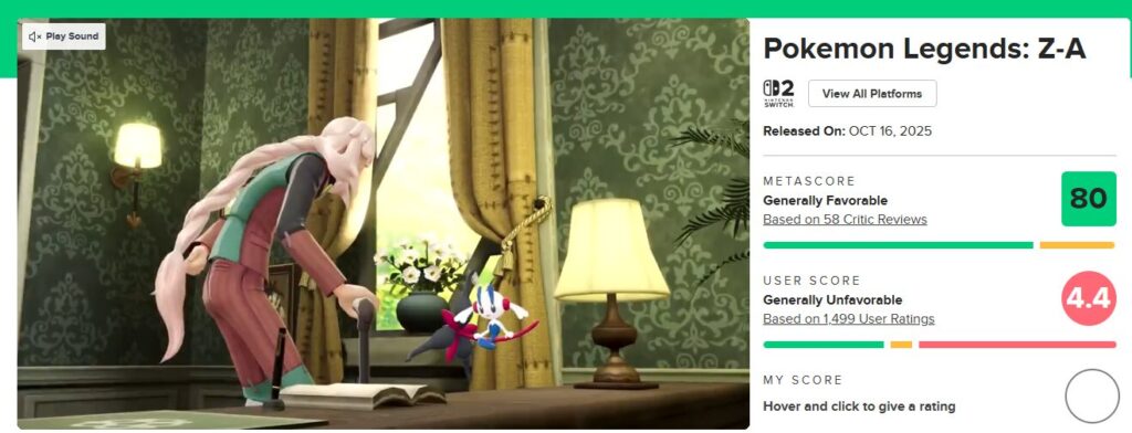 《寶可夢傳說 Z-A》(《Pokemon Legends Z-A》)發售後拿下了 80% 的 Metacritics 好評,看似風光,但玩家分數卻是慘烈的 4.5 (剛一看又掉到 4.4)分。這種媒體誇、玩家罵的場景,對許多玩家來說早已不是第一次啦!表面上它很穩、有新機制、有 Mega 進化、有新戰鬥系統,但骨子裡,它代表的其實是整個寶可夢品牌的老化與疲乏!