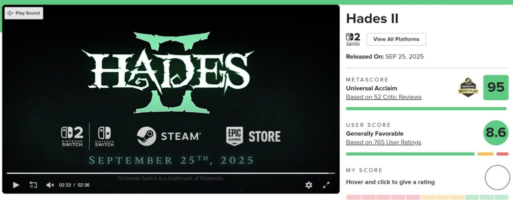 2025 年遊戲市場熱度持續飆升,多款作品接連突破評分天花板,而其中最耀眼的當屬 Supergiant Games 帶來的《黑帝斯 II》(Hades 2)。本作於 9 月 25 日正式脫離搶先體驗版本,在 Metacritic 上獲得 95 分 的超高評價,成功拿下「Must Play」必玩評價,成為今年第六款獲此榮譽的遊戲。