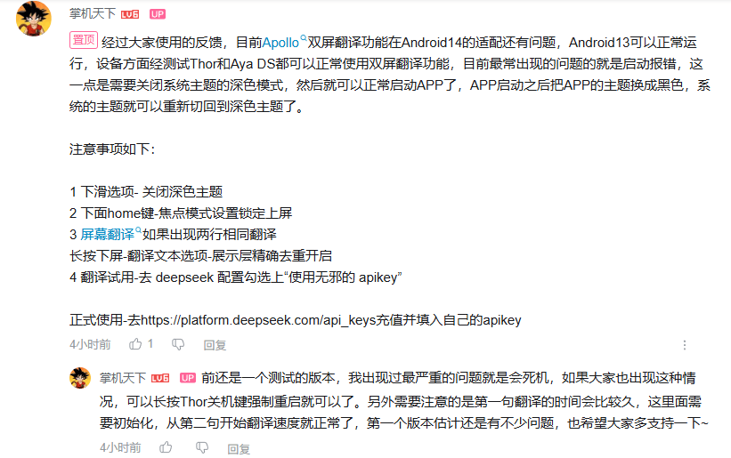 開發者表示,目前的 Apollo 仍是測試版本。他遇過最嚴重的問題是整機死機卡死,若玩家也出現同樣狀況,只需長按 Thor 掌機的電源鍵強制重啟即可。